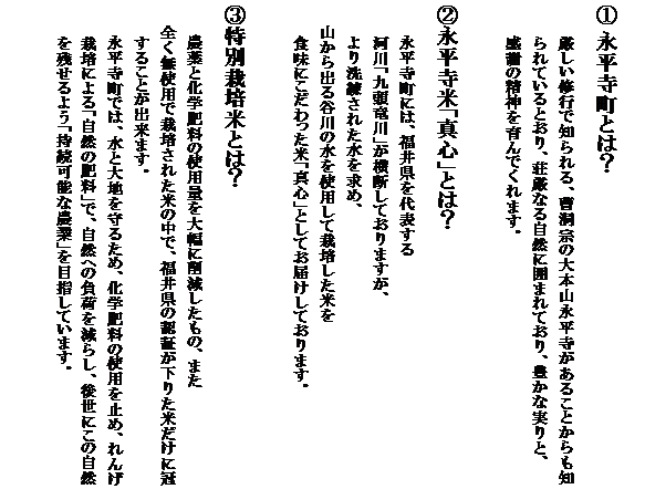 | 永平寺町産コシヒカリ | 福井県内最高品質の永平寺町のコシヒカリ。より洗練された水を求め、あえて、限定された地区の谷川の水を使用して育てました。永平寺米販売契約店のみの特別販売です。 | ||