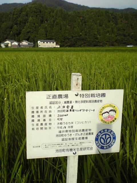 | 池田町にぶらっと行ってきました。上田さんに会えるかと、作業場に行きましたが、あいにくの留守。仕方なく、田んぼをぶらぶらとしてきました。平野部とは違い、まだまだ青い田んぼです。生育はすこぶる順調の様子。各田んぼには標識が立ててあり、栽培管理者や、認証団体等が記載されていました。池田町ではこのほかにも栽培履歴の記載されている標識もありました。認証農園そのものはさほど珍しくないのですが、池田町の数の多さは、平野部とは格段の差があるように思えます。町をあげての良質米生産の取り組みのなせることでしょう。来月の収穫が楽しみですね。 (右写真は、上田さんの栽培する田んぼと、標識です。) |