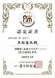 | 当店の店長、黒田昌弘は、お米マイスターとして、認定されております。 お米マイスターは、お米に関する専門知識を有し、日本米穀小売商業組合連合会の認定試験に合格したものです。 |