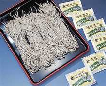 | 越前そば 福井県は、「おろしそば」に代表されるように、大変そばのおいしいところです。そばは、黒っぽい田舎そば。大変風味の良いそばです。それもそのはず、当店のそばは、特別注文で、石臼で引いたそば粉のみで作っております。このおそばに、大根おろしと、鰹削り節、きざみねぎを付けて、冷やしただしで食べる「おろしそば」は最高です。一度ご賞味ください。 平成19年度より、さらに原材料を吟味。地元福井産のそば粉を使用し、また、つなぎの小麦粉も、国内産にこだわり、さらに美味しくなりました |